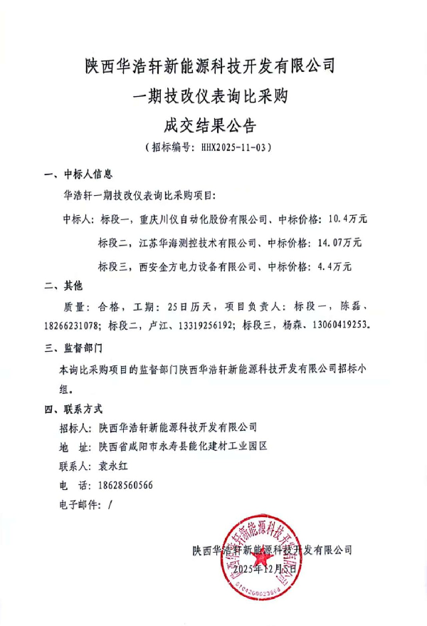 【中陕核】华浩轩公司一期技改仪表询比价采购成交结果公告
