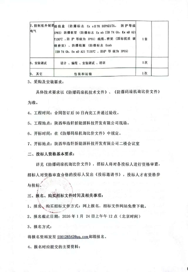 【中陕核】华浩轩公司:防爆码垛机采购及安装项目询比价公告